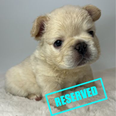RESERVED - Thick and wrinkly cream male with with a rare apricot tint. Comes from excellent structure and temperament lines. AKC registered. Genetically health and color tested. Microchipped. Health Guarantee.