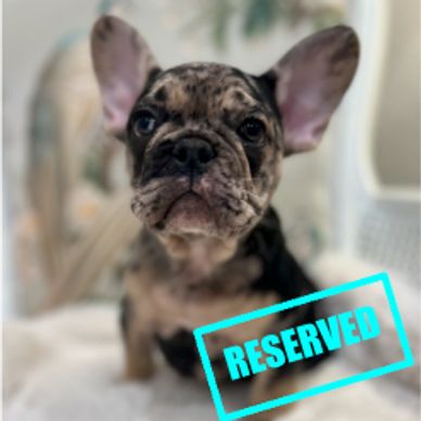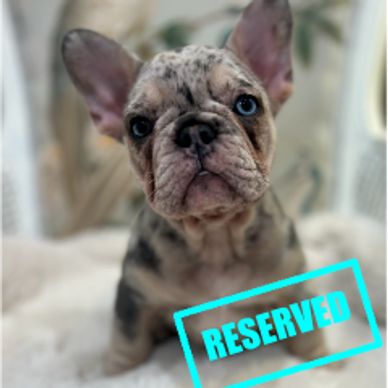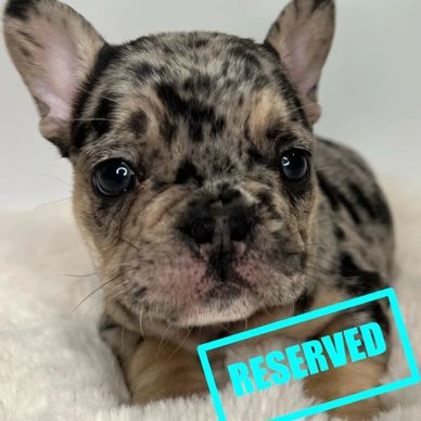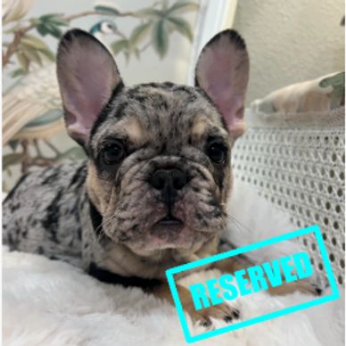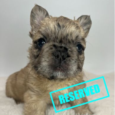 This visual fluffy beauty is a fawn merle carrying tan points, cocoa, and cream. She has a very nice block head and wide muzzle and may have excellent breeding potential for breeders interested in long-haired frenchies.