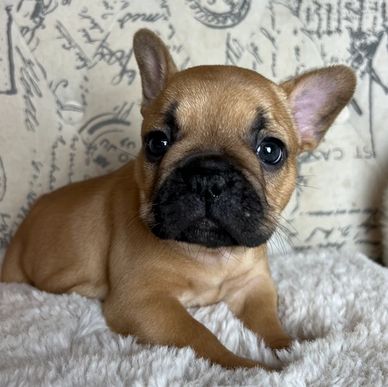 This little girl is a standard fawn with a black mask. She will lighten a little as she gets older but will stay fawn. She is chunky and spunky and loves attention. She will be ready to go home August 1, 2024.